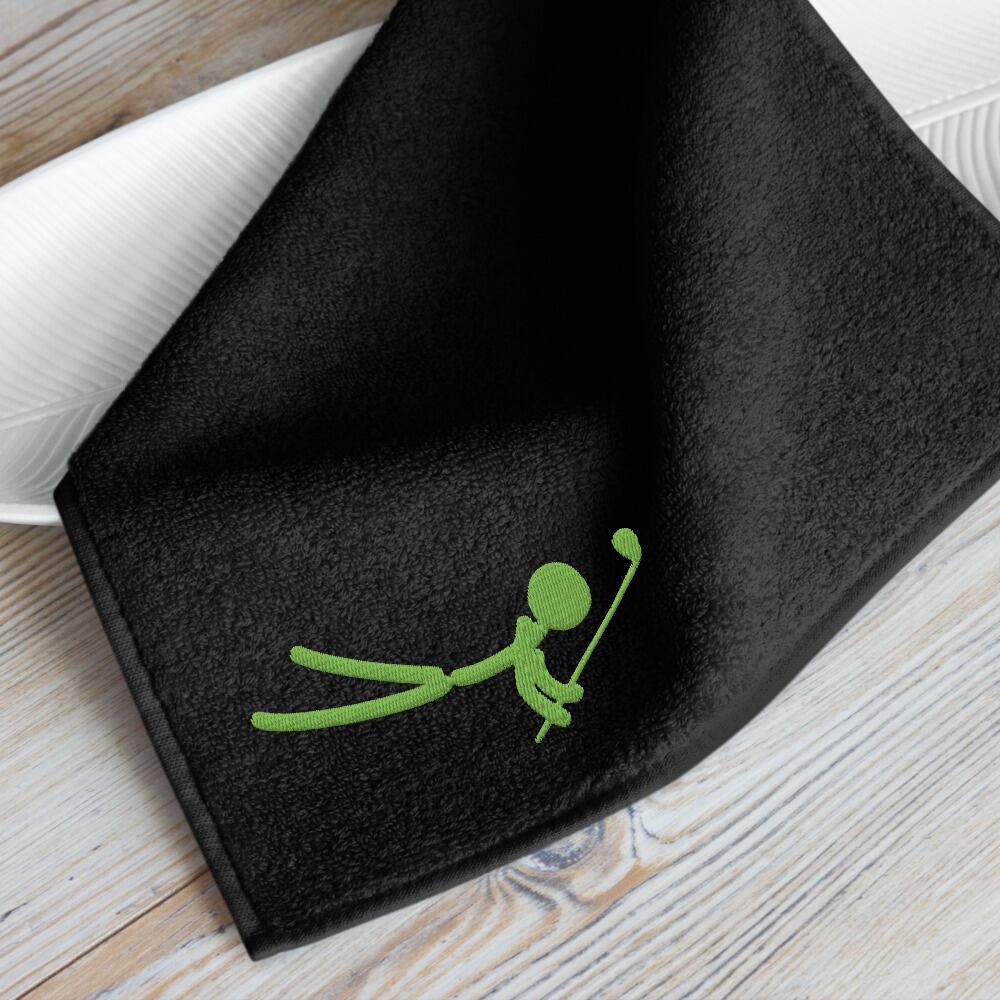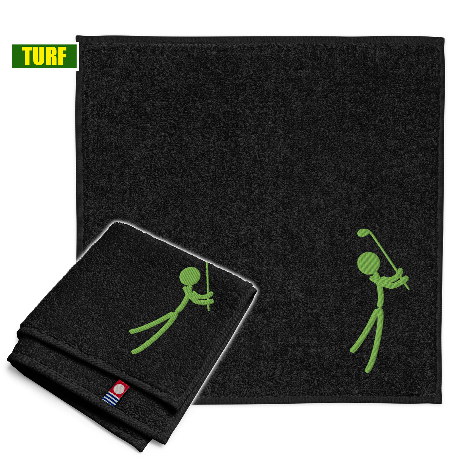 Surf&Turfロゴの中でナイスショットを決めるスティックヒューマンが刺繍されたタオルハンカチ。ゴルフなどのスポーツシーンはもちろん、普段使いにもぴったりです。